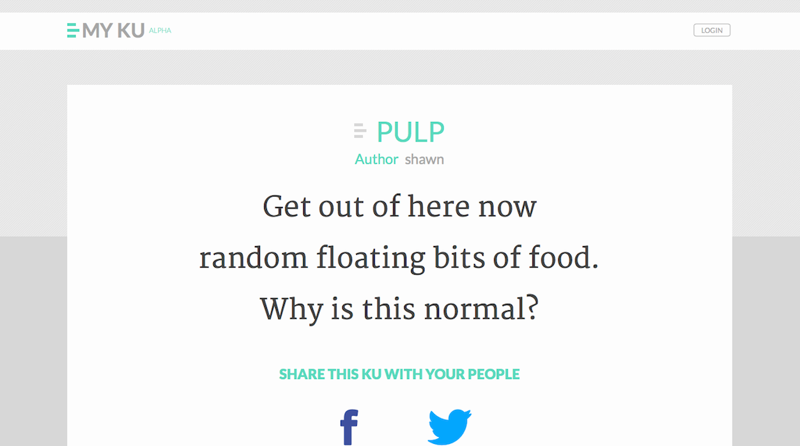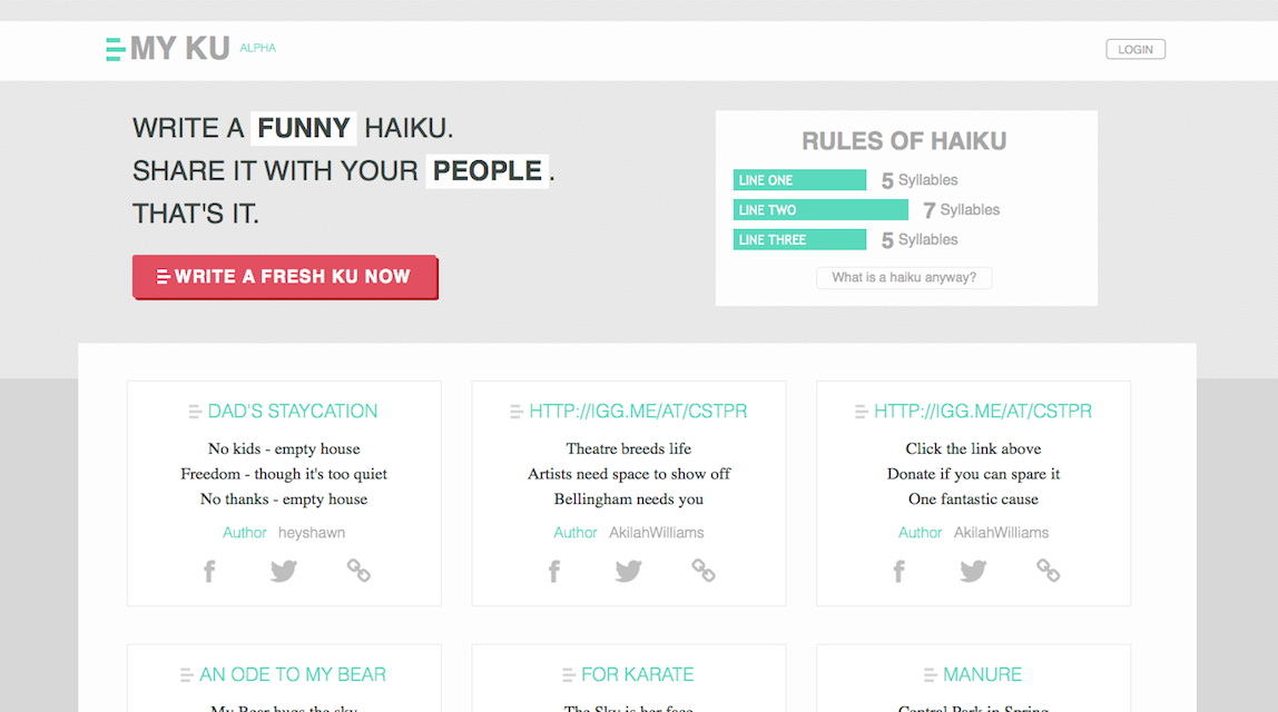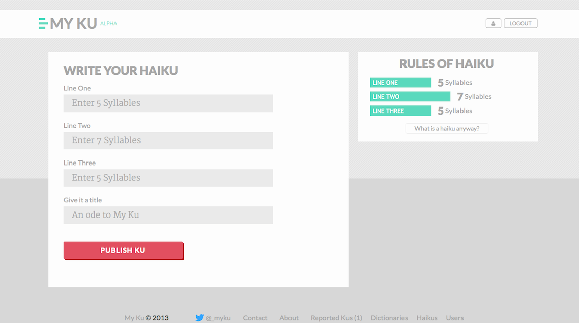 MY KU is a fun web app that allows users to write and share haikus. Each "poet" a.k.a user user has a personal page that allows them to proudly show off the haikus they create.
